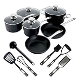 16-piece Berndes Coquere Induction Forged Aluminum Cookware Set Includes one each: 1.75 and 2.25 quart Covered Sauce Pans, 8 and 9.5 inch Open Fry Pans/Skillets, 3.75 quart deep Covered Saute Pan, 5 quart Covered Stock Pot, Whisk, Slotted Turner, Silicone Brush, Potato Masher, Grater, Small Ladle.- European design and styling; riveted 18/10 stainless steel hallow cast handle
