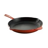 Le Creuset pans and skillets yield impeccable results time after time. The inner cooking surface is satin black enamel which seals in juices creating a succulent and tender meal. The uniform heating of cast iron ensures completely even cooking across the pan surface. The assist handle allows for easy lifting and all pans and skillets are dishwasher safe so clean up is a breeze. Ideal for searing, sauteing, tenderizing, frying and deglazing.Turn out restaurant-caliber frittatas and gold-star gravies with this 11-3/4-inch enameled cast-iron skillet from the French line Le Creuset. Coated with a chip-resistant porcelain enamel, the skillet offers the even heat and gentle cooking of cast-iron without reaction to foods or the usual high maintenance. The integral iron handle is oven-safe to 450 degrees F, so the skillet can go straight from the freezer to the burner to the broiler. An easy-to-grip helper handle makes the pan's substantial weight manageable, while dual pour s pouts accommodate right- or left-handers. Le Creuset's porcelain enamel livens up the kitchen or table, comes with a lifetime warranty, and cleans up in the dishwasher. --Emily Bedard- 11-3/4-inch enameled cast-iron skillet with dual pour spouts