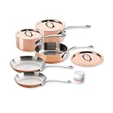Set includes 1.9-quart sauce pan with lid, 3.6-quart sauce pan with lid, 3.2-quart saute pan with lid, 8.6-inch frying pan, 10.2-inch frying pan and 5-ounce Copperbrill cleaner.- Mauviel's m'heritage collection is made of two traditional cooking materials: copper and stainless steel, (90-percent copper and 10-percent 18/10 stainless steel)