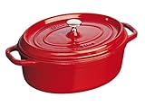 The Staub journey begins in Alsace, France. Rich in history, food, and craft, it is a region renowned for hearty one-pot recipes. Staub has been producing the best cast iron products for professional and aspiring cooks since 1974. Staubâs French oven is a timeless standby for stews, roasts, soups, casseroles and other one-pot classics. Staub has perfected this tradition in our signature "La Cocotte" French Oven, the choice of some of the world's best chefs. La Cocotte moves beautifully from the stove to your table.An inspired fusion of old and new, function and style, Staub's La Cocotte French ovens are destined to be lifelong members of any kitchen. Fill this handy 7-quart oval cocotte with lemon-rosemary chicken, a medley of garden vegetables, or hearty cioppino to turn out delicious, easy meals. Crafted of enameled cast iron for uniform warming and superior heat retention, the heavyweight cocotte performs best at low to medium temperatures over longer time periods so flavors intensify and foods stay scrumptiously moist. The interior features a black matte finish that is almost indestructible and doesn't need seasoning; rather, the oils produced in cooking seep into the surface pores to create an organic nonstick coating. The rougher matte also browns, braises, and reduces better than a shiny polished glaze. In a clever use of modern technology, the cocotte's tight-fitting lid is studded with computer-designed spikes that catch and release steam to self-baste the entire surface of the meal.As handsome as it is hardworking, this vessel is fitted with a solid stainless-steel or brass finial that is generously sized for easy lifting and oven-safe to 600 degrees F. The exterior enamel also comes in a variety of fashionable colors that coordinate with other Staub cookware and offer an always-fresh serving appeal-go with a clean monochromatic look or mix up rich tones for a layered presentation. Cast in a single-use sand mold, each piece has its own subtle variations to make it truly unique, and the Staub name is molded into the lid and side handles for a fun rustic touch. The double-coated enamel resists chips and rust, and the smooth bottom is suitable for any cooking or dining surface. The cocotte goes safely into the dishwasher, though hand washing is recommended for heavy use, and it's backed by a lifetime limited warranty. --Kara Karll
